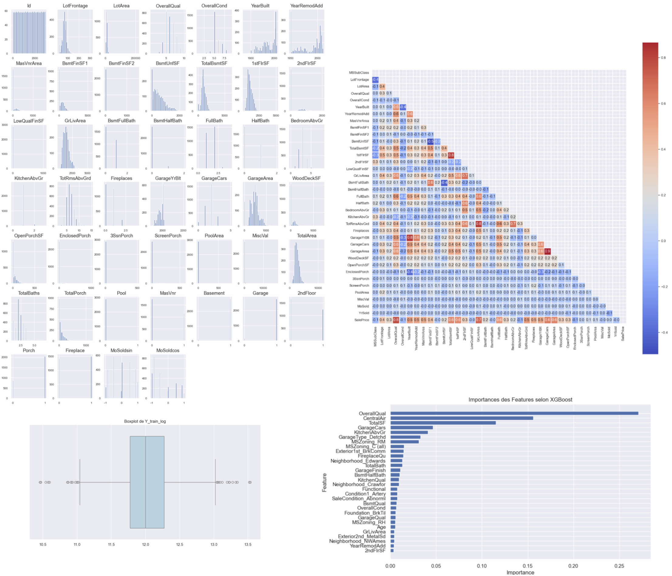 - Creation of new features (e.g., TotalArea, TotalBaths, binary flags for fireplaces, pools, etc.)